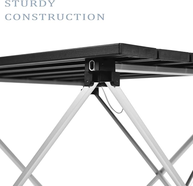 - Sturdy Construction ---- Our folding camping table is made of heavy-duty aluminum, the legs will not fold, bend or fall off with the stable foot cap, allowing it to be used on different terrains without the risk of tipping over. The triangular frame and sturdy joints make the foldable camping table can support 55 pounds of weight. So you can use this table for picnics or cooking with complete confidence