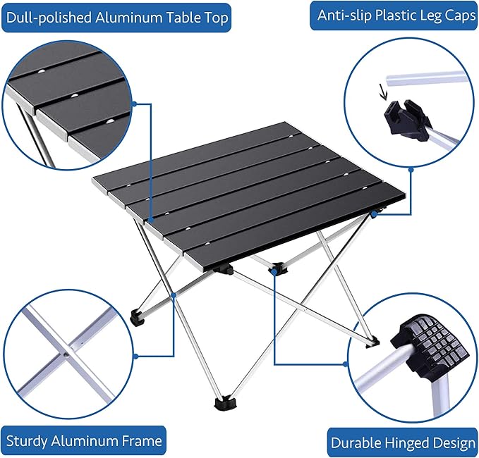 - Ultra lightweight and easy to carry - Our folding camping table has an aluminum tabletop and frame, so it is lighter than another wooden camping table of the same size, with a weight (Small: 1.85 pounds / Medium: 2.6 pounds / Large: 3.3 pounds) that is lightweight enough to carry. It can be folded into the accompanying handbag, placed in a backpack, or placed anywhere needed. The small camping table provides a stable working platform for amateur enthusiasts. This portable camping table is the perfect companion for portable camping chairs or folding stools. You can even use it as a folding beach table, or a tent table sitting on a beach mat or camping mat.