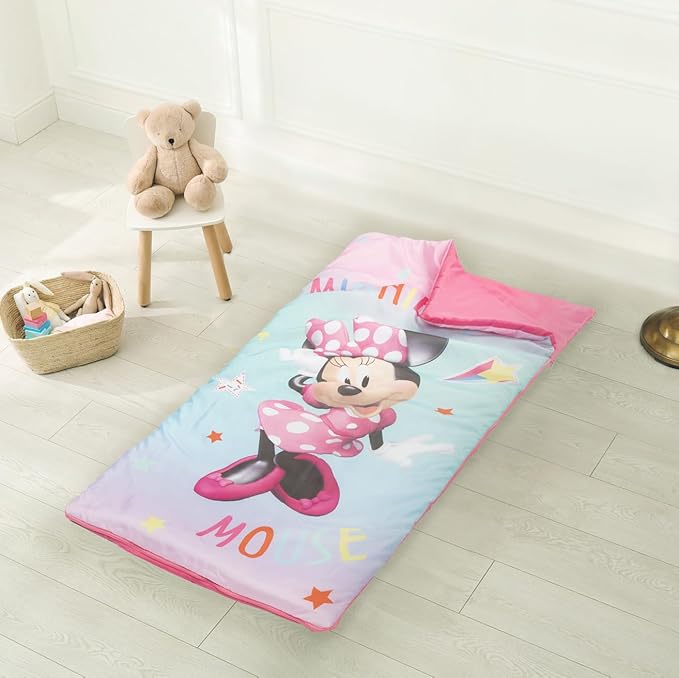 - GREAT GIFT - Minnie Mouse slumber sack is the perfect gift for your loved ones featuring designs from their favorite Disney icon. This slumber bag will make any child smile and will transform any sleep over. It rolls up for easy storage and travel. Sure to make bed time exciting!