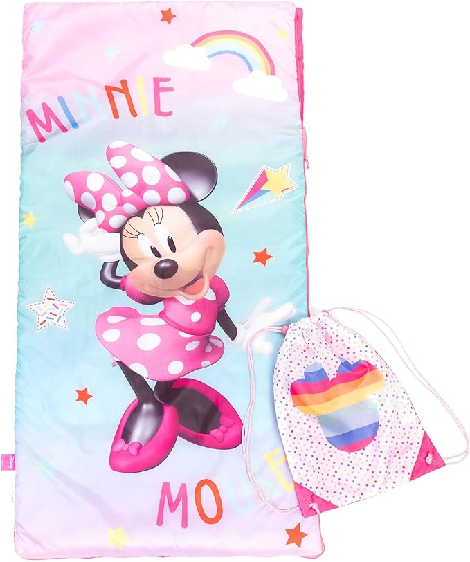 - PERFECT FIT & FUN DESIGN - This Disney Minnie Mouse slumber sack includes a slumber bag measuring 27" x 54" and drawstring sack measuring 14"x 19". Featuring your favorite Disney icon, Minnie Mouse. This fun and colorful slumber sack is sure to be the center of attention at the next sleepover, take your child's bedtime adventure anywhere!