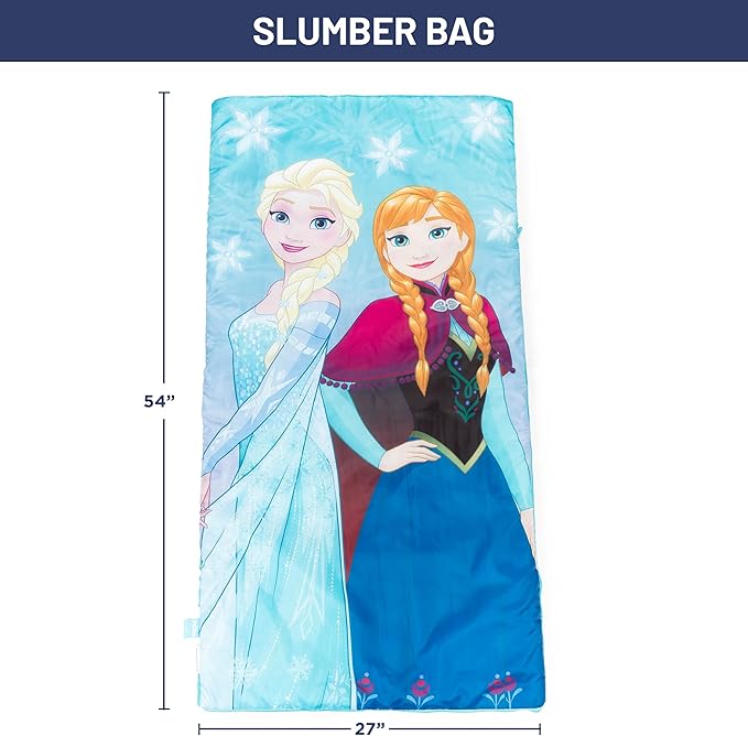 - PERFECT FIT & FUN DESIGN - This Dinsey Frozen slumber sack includes a slumber bag measuring 27" x 54" and drawstring sack measuring 14"x 19". Featuring your favorite Disney Princess sisters, Elsa and Anna. This fun and colorful slumber sack is sure to be the center of attention at the next sleepover, take your child's bedtime adventure anywhere!