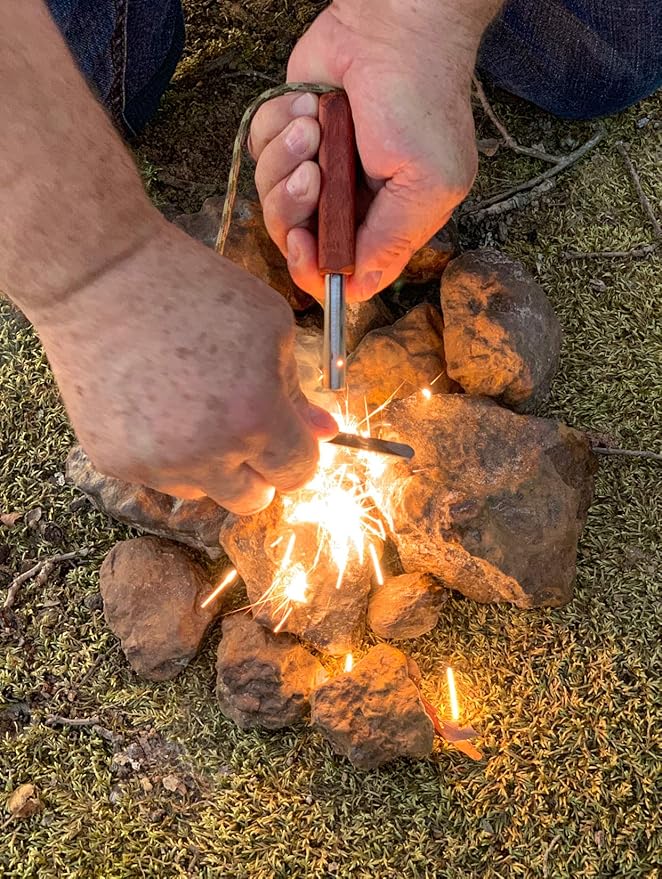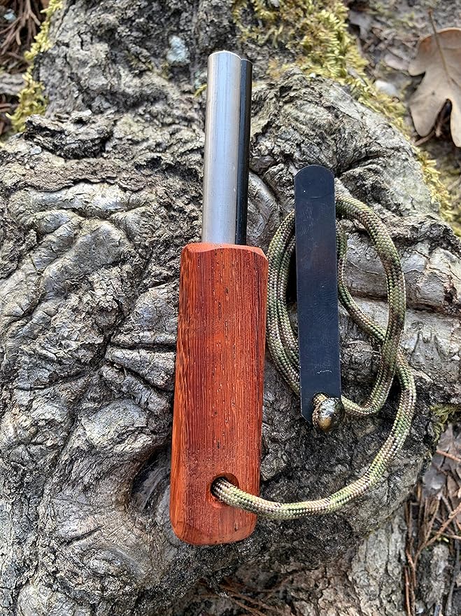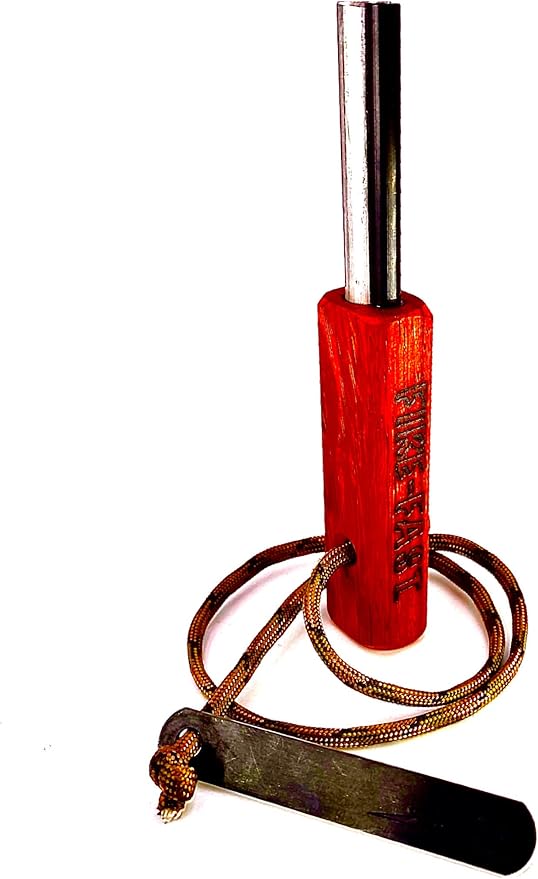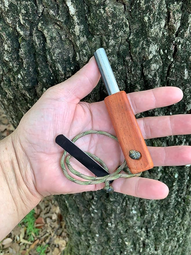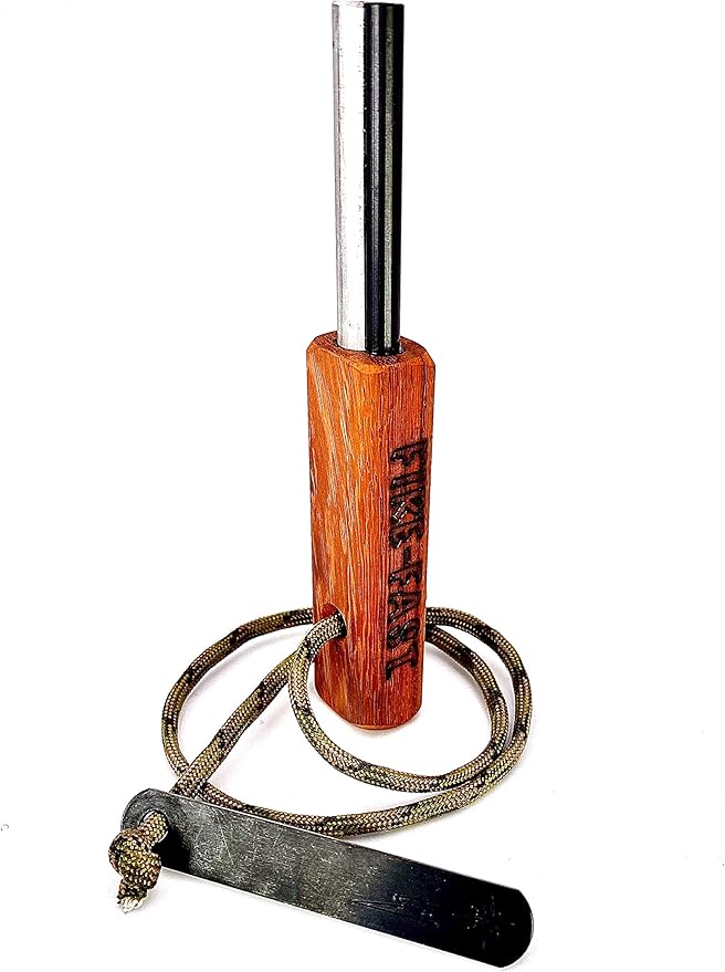 - Ferro Rod, Magnesium Rod, HardWood Handle, Paracord and Hardened Steel Striker/Scraper.