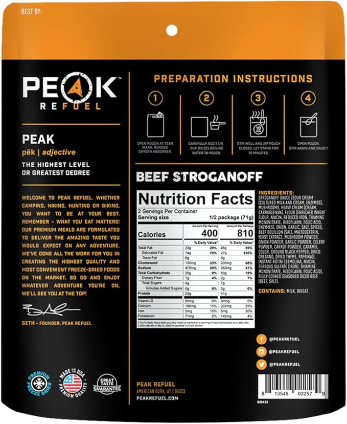 Peak Refuel Beef Stroganoff | Freeze Dried Backpacking and Camping Food | Amazing Taste | High Protein | Real Meat | Quick Prep Meals