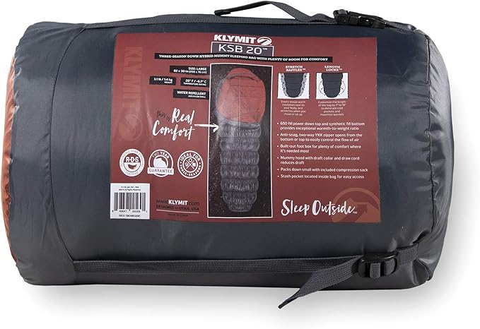 Klymit KSB Lightweight Mummy Sleeping Bag, 20°F Cold Weather Sleeping Bag for Camping, Hiking, and Backpacking, Gray, Large