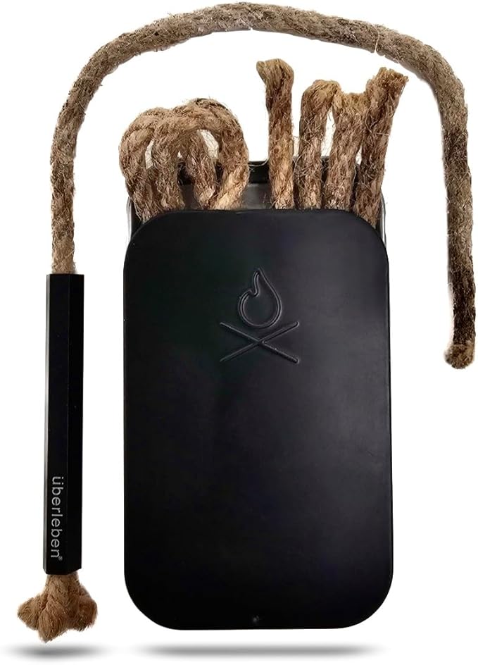 überleben Tindår Tinder Wick & Bellow Fire Starter Kit - Waterproof, 60 Min Burn Time - Paraffin Wax Rope Hemp Wick and Bellow Bushcraft Survival Kit - Black Aluminum Sleeve & Slider Box