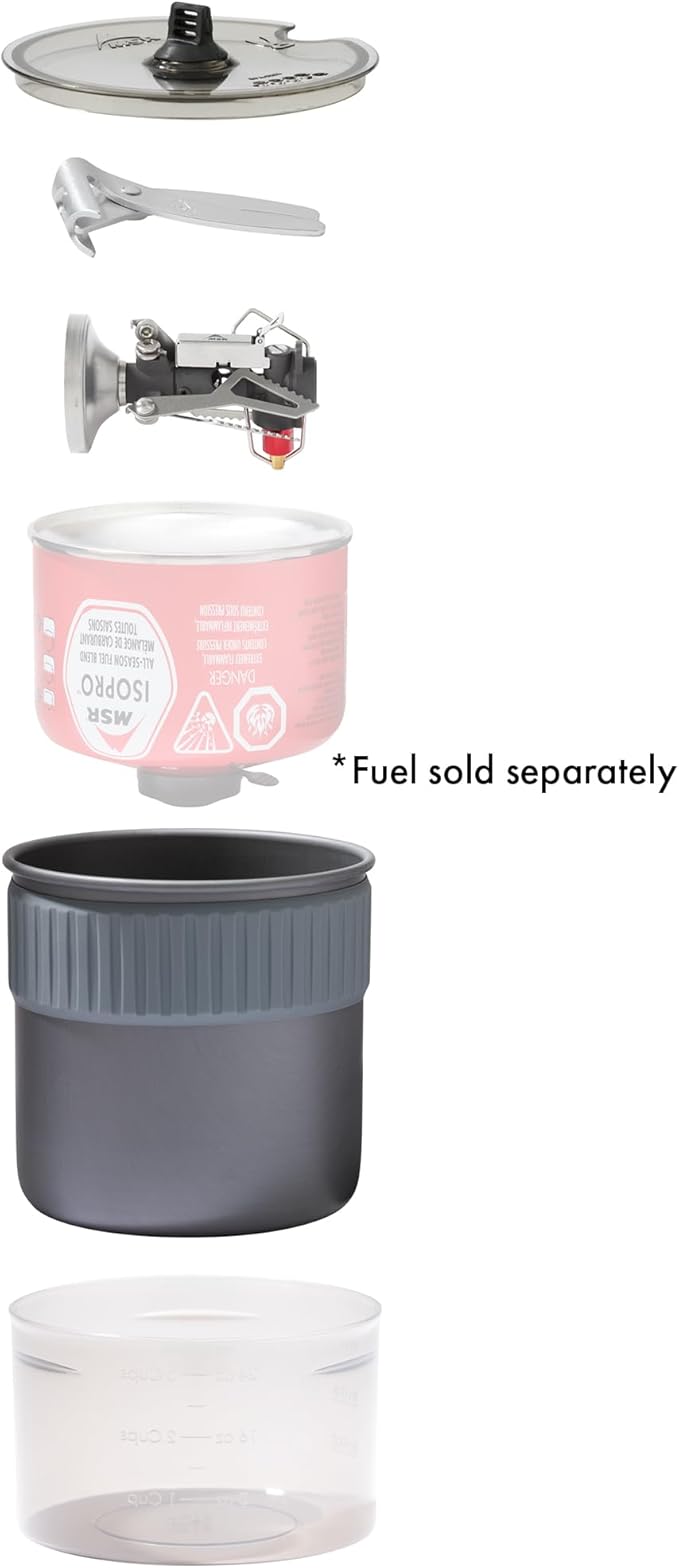 - Kit nests together with room to fit an optional MSR fuel canister inside pot (fuel canisters sold separately); cook set has the capacity to serve two