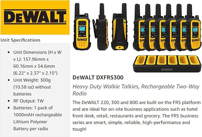 DEWALT DXFRS300 1 Watt Heavy Duty Walkie Talkies - Waterproof, Shock Resistant, Long Range & Rechargeable Two-Way Radio with VOX (6 Pack w/Gang Charger) (DXFRS300-BCH6)