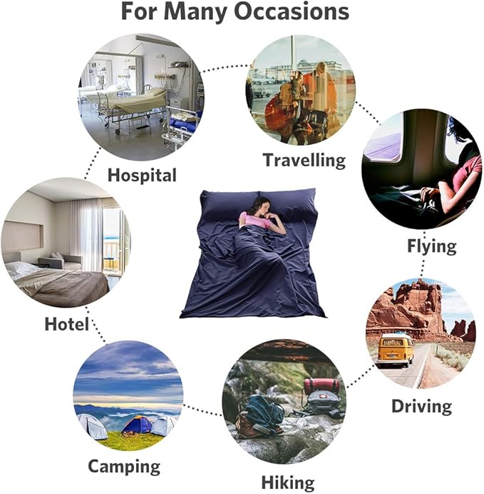 - 【Function of Sleeping Bag Liners and Complete with Pillowcase】: sleeping bag liners are breathable and comfortable, which is ideal to bring to hotels, youth hostel, or anywhere else you might travel. Take comforter off bed and use this to sleep in and it will give you a sense of cleanliness. You can use this versatile travel sleeping bag liners inside your sleeping bag to keep it clean, or use as a stand-alone sleep cover or sleeping bag in very warm climates