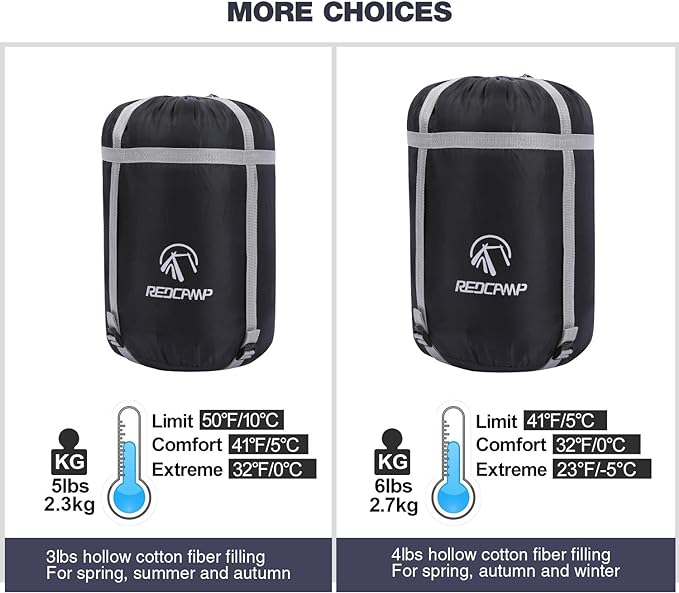 - Compressed Sack: Redcamp sleeping bags for camping include a convenient external compressed oxford sack. Package size: 18"x8"x8"/45x20x20cm. Pack weight: 5lbs/2.3kg.