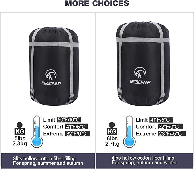 - Compressed Sack: Redcamp sleeping bags for camping include a convenient external compressed oxford sack. Package size: 18"x8"x8"/45x20x20cm. Pack weight: 6lbs/2.7kg.