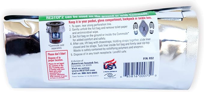 - SEALS IN WASTE AND CONTAINS ODORS: The RESTOP 2 (RS2) utilizes a patented “bag within a bag” heavy gauge design to safely contain up to 32 ounces of liquid or solid human waste. The RS2 has a triple barrier bag design and zip-lock closure to ensure added protection from leakage and odors.