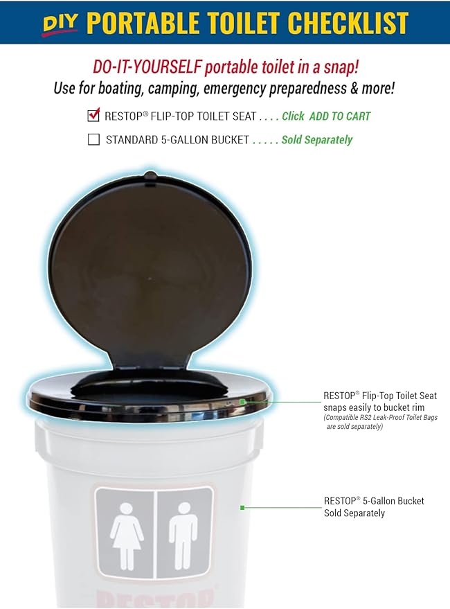 - DIY TOILET-IN-A-SNAP: The RESTOP Fliptop Toilet Seat will help you make a DIY portable toilet in a snap for your boat, next camping adventure, and much more. Just purchase a standard 5-gallon bucket separately.