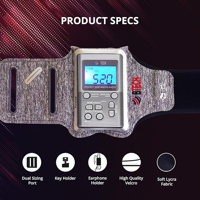 - Our radio armband also includes a flap to store your earbuds while you are not using your MPR-AF1.