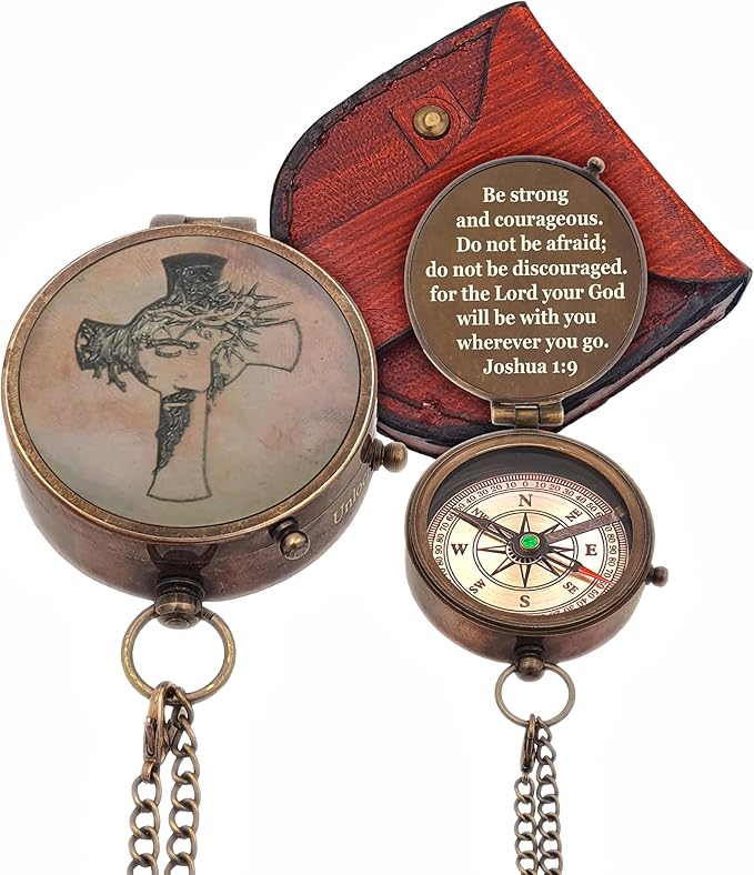 Be Strong and Courageous Brass Religious Compass Gift Confirmation Baptism Easter Christian Catholic Graduation Trekking Adventure Engraved Scripture Prayer Gift for Men Women Teenage Boys Girls