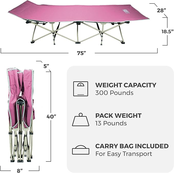 - ULTRA COMFORTABLE - The open sleeping cot dimensions are 28 inches wide, 75 inches long, and 18.5 inches high so you can sleep comfortably on your side or back; an elevated headrest ensures comfort with or without a pillow.