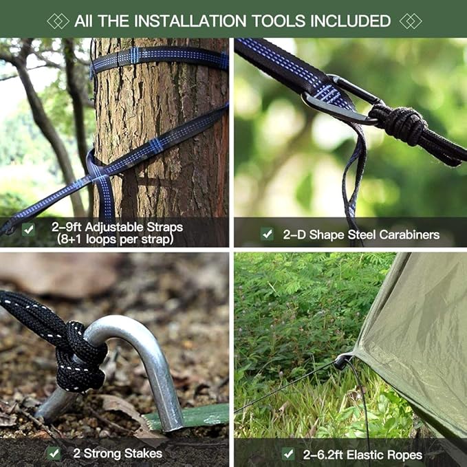 - ALL PARTS INCLUDED. Even a kid can set up this hammock in minutes. 2 hammock straps(2×10 adjustment loops + 20 ft long combined) 2 carabiners (solid steel/D-shaped) 2 high-strength stakes 2 elastic ropes. Of course, you can easily use this outdoor hammock with a hammock underquilt and a hammock rain fly in your next adventure