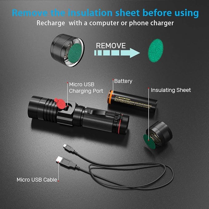 - [ USB Rechargeable Flashlight ] : Equipped with an upgraded rechargeable battery to prevent overcharging to ensure safety and extend the life of the flashlight. Charging is easy from any USB port. Note: Before using for the first time, remove the battery insulation sheet. (Insulation plates are used to protect the battery during transportation.