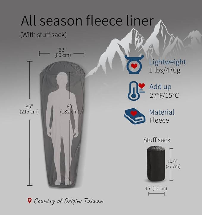 - THICKER & WARMER: Our lightweight sleeping bag liners are made using thicker, softer and lightweight fleece to provide you with a convenient way to stay warm and comfy in the outdoors. This all season sleeping bag liner can add up to 27F to your sleeping bag so you can sleep comfortably through the night