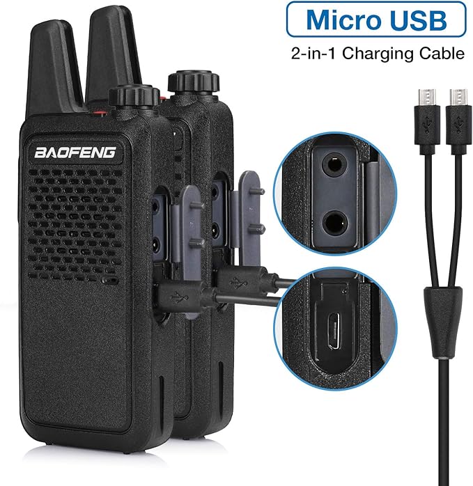 - [USB Y-charging Cable] More convenient than recharging through the mini USB port. Baofeng GT-22 walkie talkies could be easily recharged with a power bank, car charger, and Laptop whenever you need to work outside. Allows recharging two radios at a time.