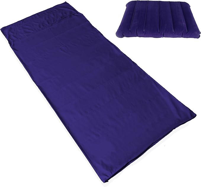 Sleeping Bag Liner, Blue Microfiber Adult Sleep Sack Travel Sheet with Zipper for Camping or Traveling Complete with a Carry Bag and Inflatable Pillow