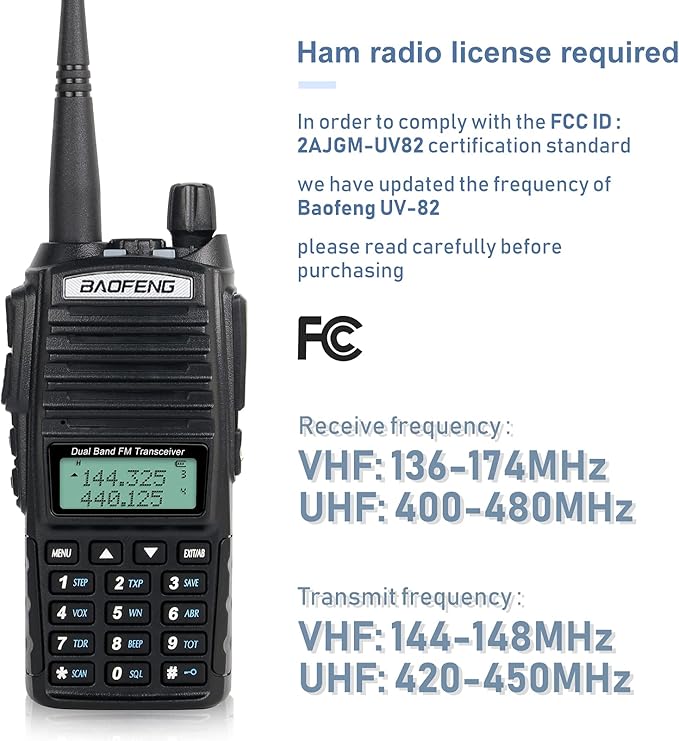 - ✔️Receive Frequency Range: VHF: 136-174 MHz; UHF: 400-480 MHz Transmit Frequency Range:VHF:144-148MHz;UHF:420-450MHz (Can not transmit with frs radio and gmrs radio); 128 channel memory, fully in compliance with the FCC part 15B and part 97 regulations;FCC ID: 2AJGM-UV82