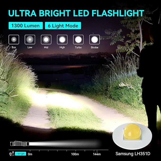 - 【Two Groups UI】Stepped mode: (4+2 Modes) has Eco(2LM)/Low(50LM)/Medium(300LM)/High(700LM) and hidden Turbo(1300LM) and Strobe(1300LM), quick double click to activate Turbo modes, quick triple click to activate Strobe modes, Or choose ramping mode between 2LM and 1300LM. Which are fun to play with and great for emergency. This flashlight always do great job whenever you need different lumens for reading, hiking, camping, hunting, fishing, dog walking, repairing etc.