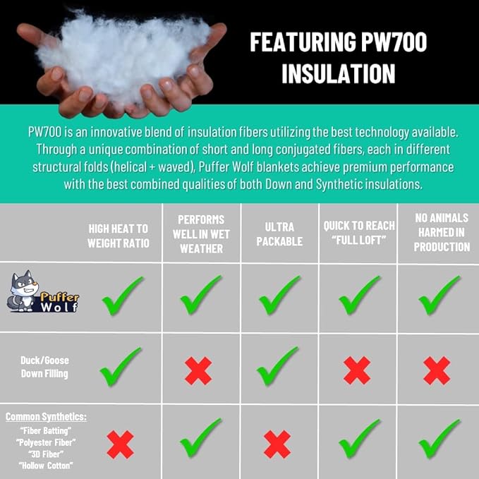 - ✅ THE BEST OF BOTH WORLDS! Insulated with our innovative new PW700 Featherlight Premium Insulation, which has an industry leading thin denier and unique air trapping wavelength pattern. Our blankets have a high heat-to-weight ratio similar to that of high fill power goose down or duck down, yet also have the same great wet weather performance and hypoallergenic properties of premium synthetic down. This makes our blankets oh-so-soft yet extremely tough, no matter the terrain or weather!