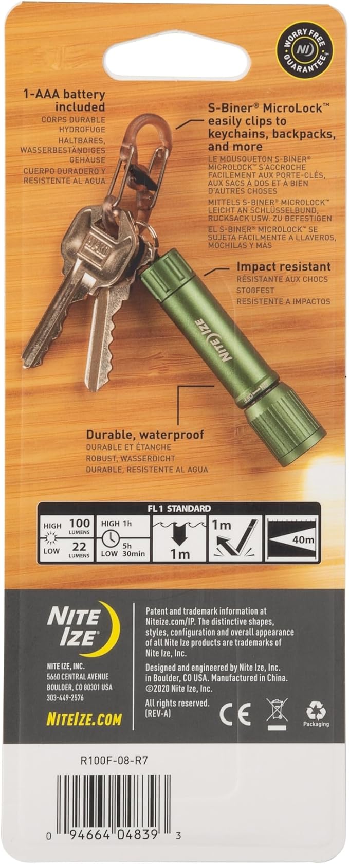 - Compact Keychain Light: This keychain with a micro flashlight features 100 lumens of light in a compact body; the S-Biner MicroLock offers easy locking attachment to keys and backpacks