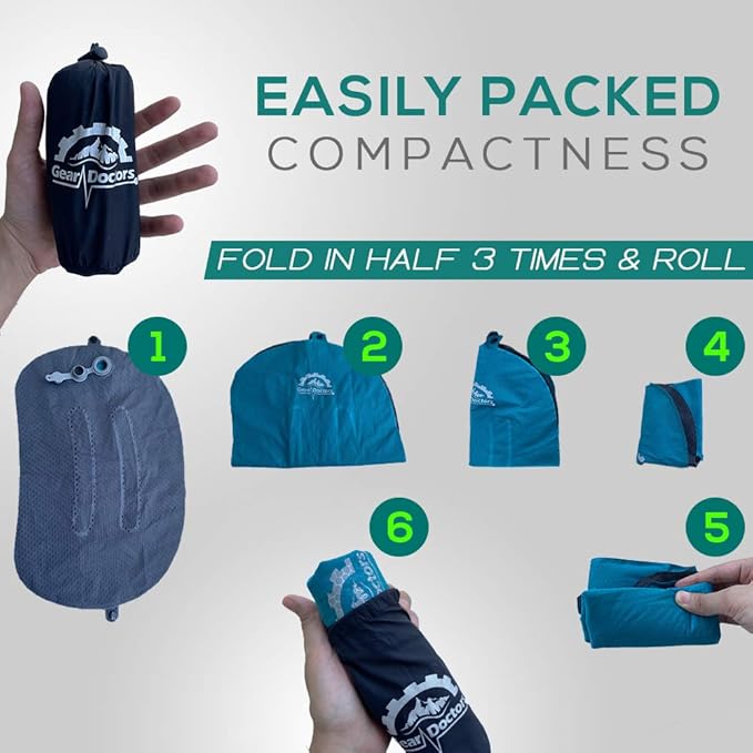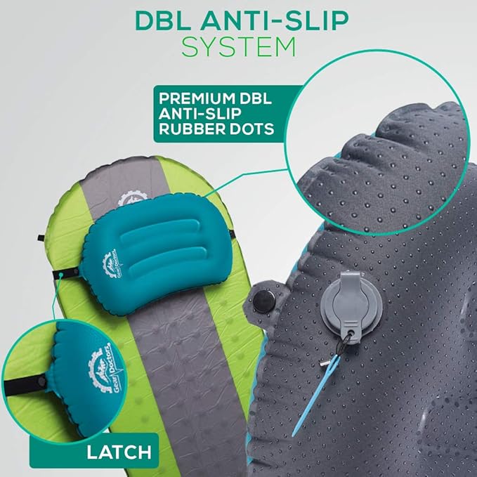 - 𝐃𝐨𝐮𝐛𝐥𝐞 𝐀𝐧𝐭𝐢-𝐒𝐥𝐢𝐩 𝐒𝐲𝐬𝐭𝐞𝐦: Rubber dots at the bottom fabric make Gear Doctors Camping Pillow stable on any Nylon , Polyester or other slippery sleeping pad fabric , If that is not enough you can use the detachable latch to lettarly tie the pillow to your sleeping pad , or even any car/ office chair , No more sliding noises or waking up to readjust your pillow