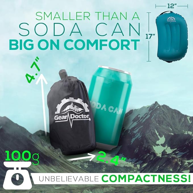 - 𝐒𝐦𝐚𝐥𝐥𝐞𝐫 𝐓𝐡𝐚𝐧 𝐀 𝐒𝐨𝐝𝐚 𝐂𝐚𝐧 𝐘𝐞𝐭 𝐁𝐢𝐠 𝐎𝐧 𝐂𝐨𝐦𝐟𝐨𝐫𝐭 : Packs small 2.4 *4.7 inch, unfolding to a 12*17 Inch wide pillow with a thickness of 4.3 inches and weights only 3.5 oz . No longer sleep on the excess clothing in your gear bag