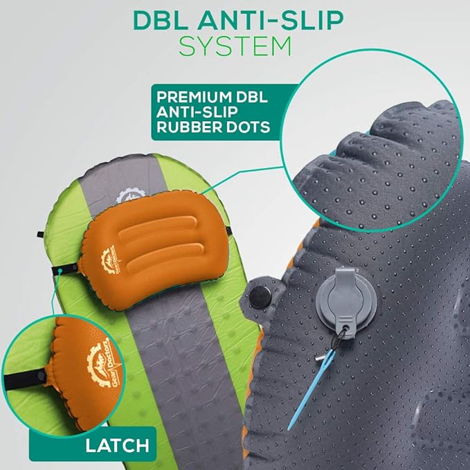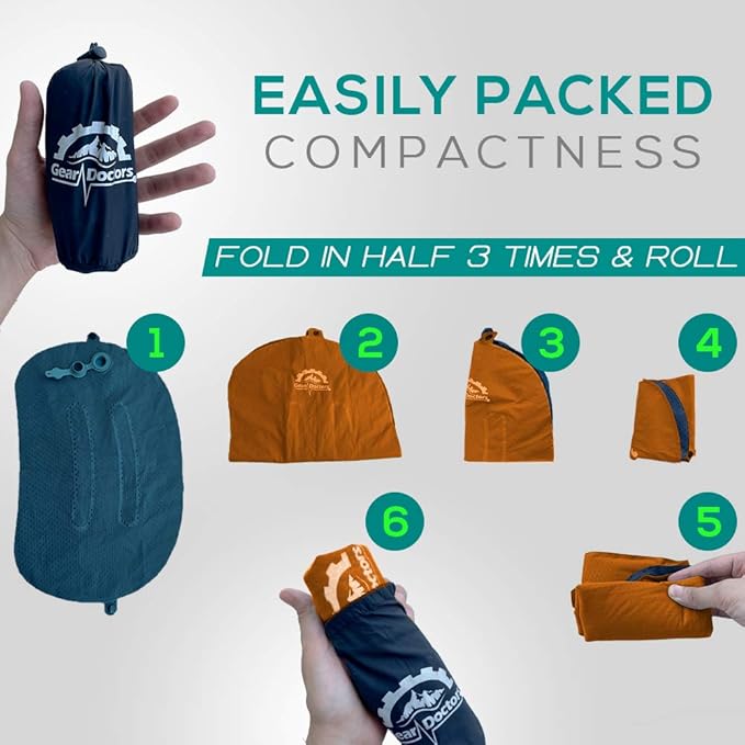- 𝐃𝐨𝐮𝐛𝐥𝐞 𝐀𝐧𝐭𝐢-𝐒𝐥𝐢𝐩 𝐒𝐲𝐬𝐭𝐞𝐦: Rubber dots at the bottom fabric make Gear Doctors Camping Pillow stable on any Nylon , Polyester or other slippery sleeping pad fabric , If that is not enough you can use the detachable latch to lettarly tie the pillow to your sleeping pad , or even any car/ office chair , No more sliding noises or waking up to readjust your pillow