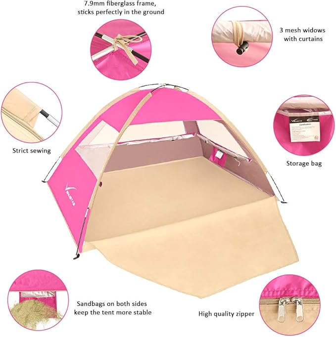 - Easy Set Up: Venustas shade sun tent is much easier to fold than a Pop-up tent. Setting up this beach tent is a fast and easy process that can be done in minutes. The unique folding capability of this tent allows it to be taken down and stored anywhere. It could also fold into a portable carry bag.
