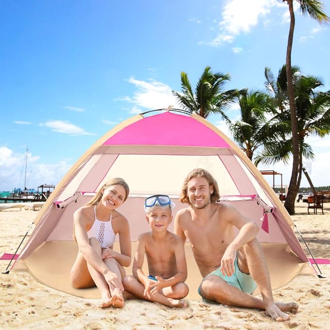- Updated Material: Venustas beach canopy has premium 190T Special silver coated polyester fabric, 4 layers of fabric to achieve UV protection, shading, and heat insulation. 4-sided ventilation design providing excellent ventilation. The floor extends 40 inches for an extra activity room. 3 curtains protect your privacy.