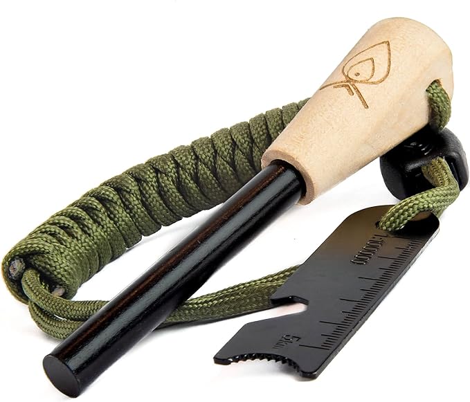 - INCLUDED SURVIVAL TOOL features a bottle opener, hex wrench, micro ruler, map scale and sharp spine scraper. It is affixed to the ferro rod by the 48” braided paracord lanyard for quick easy retrieval and use.