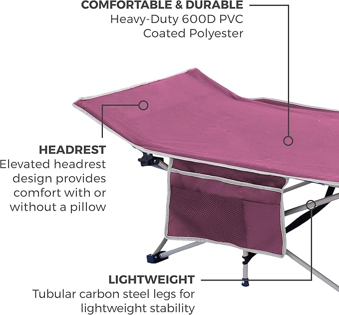 - ULTRA COMFORTABLE - The open sleeping cot dimensions are 28 inches wide, 75 inches long, and 18.5 inches high so you can sleep comfortably on your side or back; an elevated headrest ensures comfort with or without a pillow.