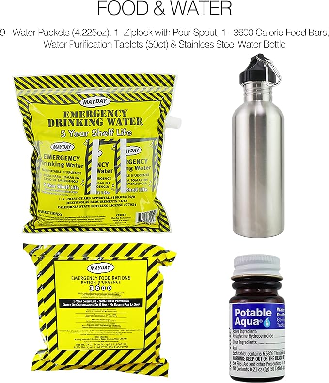 - FOOD AND WATER: Everything you need in case of an emergency. 1 survival food bar (3600 calories) and water pouches with a 5-year shelf life, water purification tablets and a water bottle