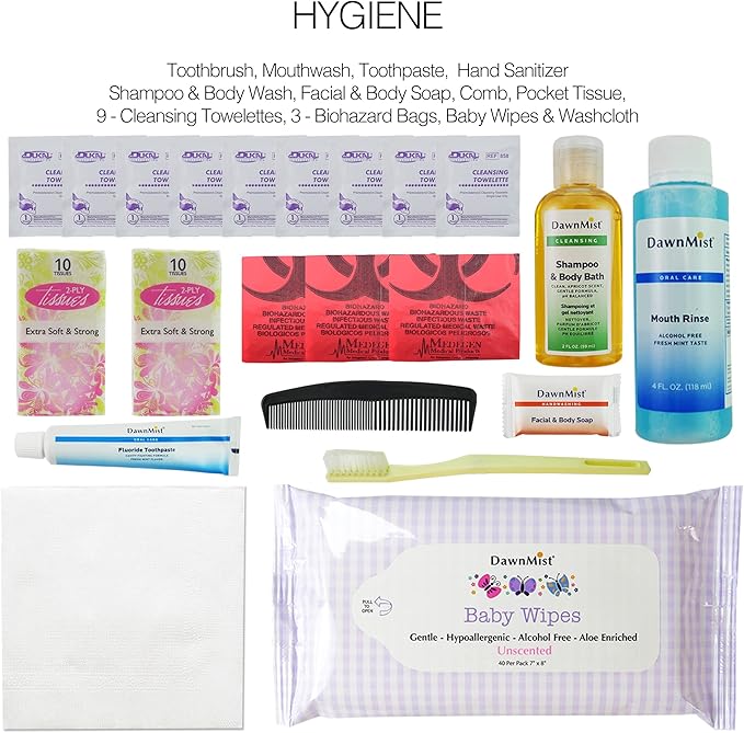 - Included Components : (2) Pair of Nitrile Gloves, (1) Pair of Leather Gloves, (1) N-95 Dust Mask, (1) First Aid Kit, 33 Pieces, (1) Heavy Duty Multi Tool, (1) Pocket Tissue Pack, (1) Survival Knife, (1) Duct Tape - 10 Yards, (1) 5-in-1 Survival Whistle, (1) Emergency Poncho, (1) Emergency Survival Blanket, (6) Pre-Moistened Towelettes, (1) Cord - 25', (1) 5-Year Shelf Life Emergency Food Bar, 2400 Calories, (9) 5-Year Shelf Life Emergency Water Pouch, 4.225 oz., (1) Water Carrier with Pour Spout, (1) Water Purification Tablets for Up to 25 Quarts, (3) Bio-Hazard Bag, (1) Bar of Soap, (1) Knit Cap, (1) Pocket Pack of Tissue, (3) Wet Wipe, (1) Moist Wipes in Soft Dispenser, (1) Emergency Power Station, (1) Document Holder - 13” x 9”, (1) 12 Hour Light Stick, (1) Stainless Steel Water Bottle, (1) Toothbrush, (1) Toothpaste, (1) Mouthwash, (1) Comb, (1) Shampoo, (1) Washcloth (2) Pair of Nitrile Gloves, (1) Pair of Leather Gloves, (1) N-95 Dust Mask, (1) First Aid Kit, 33 Pieces, (1) Heavy Duty Multi Tool, (1) Pocket Tissue Pack, (1) Survival Knife, (1)… See more