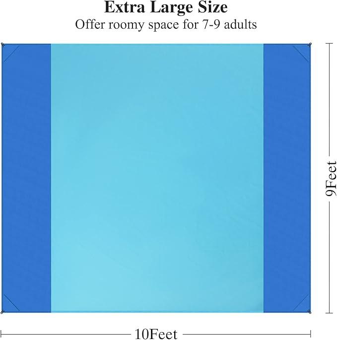 - Extra Large Size & Compact Waterproof Blanket: This family size sand free beach blanket measures 10‘X9'(275cmx305cm), which offers roomy space for 7-9 adults comfortably, this big beach blanket is a perfect size for a family of 7-9, you can also fold this portable beach blanket into a carrying bag which is compact and easy to carry