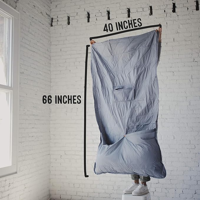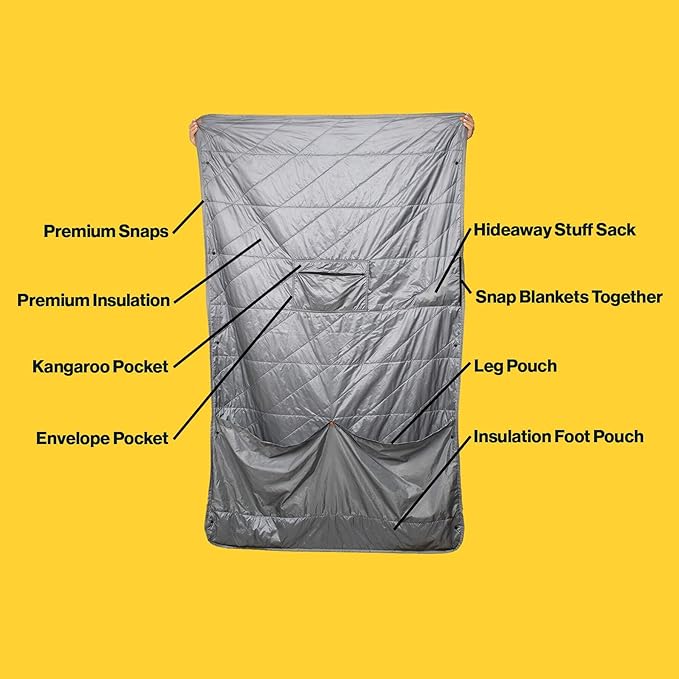 - A compact blanket made with quality materials: Crafted from soft, insulating materials, this down camping blanket doubles as a compact beach blanket or an indispensable airplane blanket for long flight. Added insulated leg pockets keep your feet warm in chilly weather.