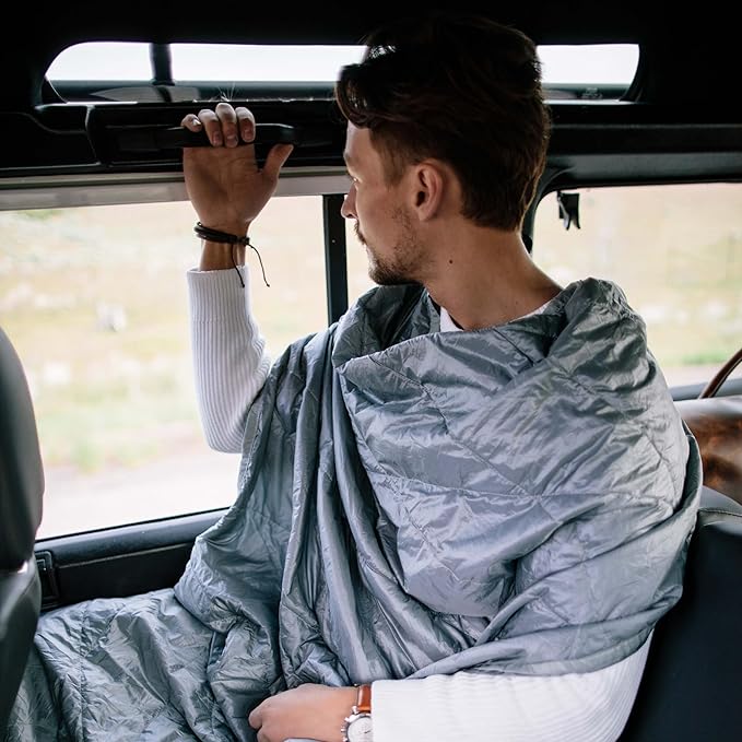 Gravel Layover Ultra-Compact Packable Down Blanket for Travel & Camping - Lightweight, Warm Travel Blanket Airplane, Car Blanket, Camping Blankets for Cold Weather - Includes Carrying Pouch (Gray)