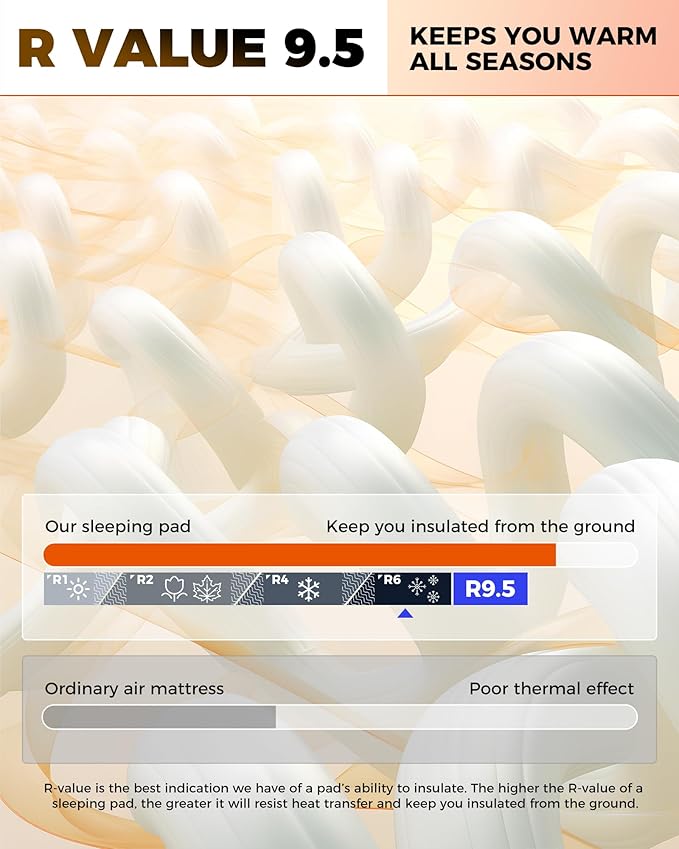 - HIGH R-VALUE 9.5 FOR SUPERIOR INSULATION: The KingCamp foam sleeping pad boasts an impressive R-value of 9.5, offering excellent insulation to keep you warm by effectively blocking the cold ground. Whether you're camping in chilly spring, fall, or winter conditions, this pad ensures you stay cozy and comfortable all night long.