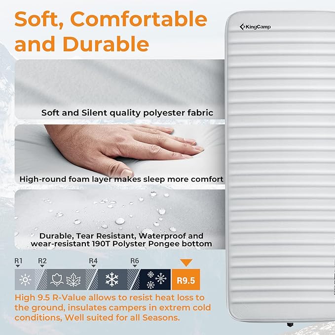 KingCamp Sleeping Pad for Camping, Self Inflating R 9.5 Sleeping Pad for All Seasons, 3" Thick Camping Mattress Mat for Outdoor Tent Cot Car Backpacking, PVC Free (Lightgrey/Charcoal)
