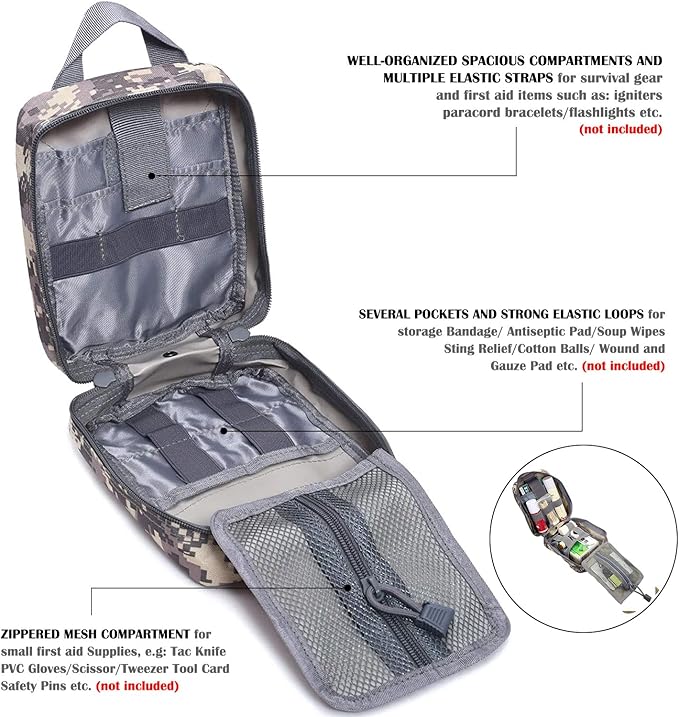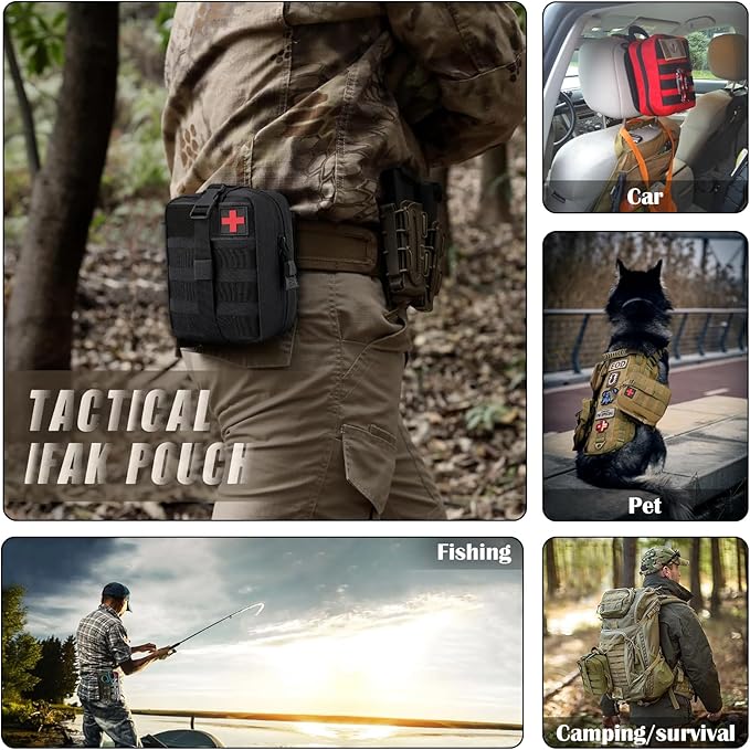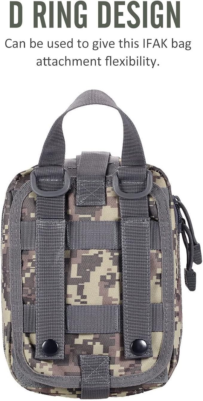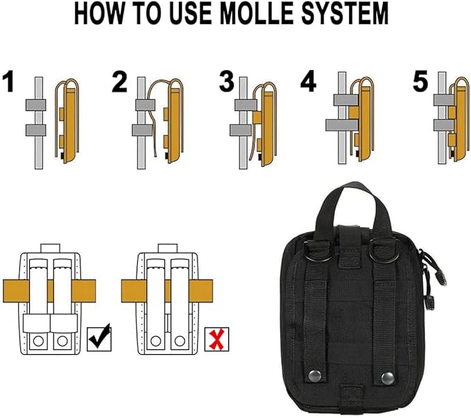- Tactical first aid bag is military grade Molle compatible tactical medical pouch, compact IFAK Universal Pouch with elastic straps inside.Perfect for carrying medical supplies(Medical supplies do not included!!!.).