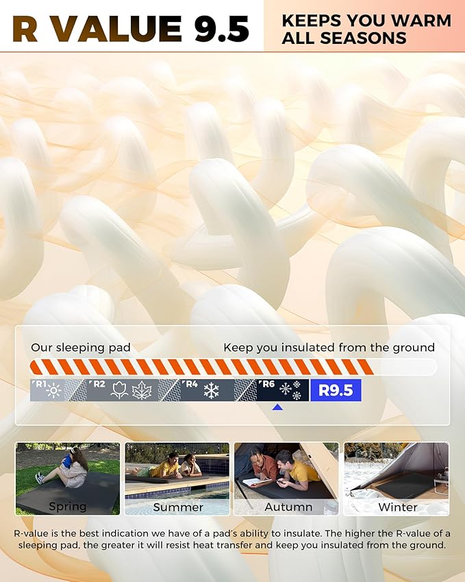 - HIGH R-VALUE 7.9 FOR EXCELLENT INSULATION: The KingCamp double sleeping pad has a high R-value of 7.9, providing superior insulation to keep you warm and comfortable, even in colder conditions. It effectively blocks the cold from the ground, ensuring you stay cozy through chilly nights during camping, hiking, or backpacking.