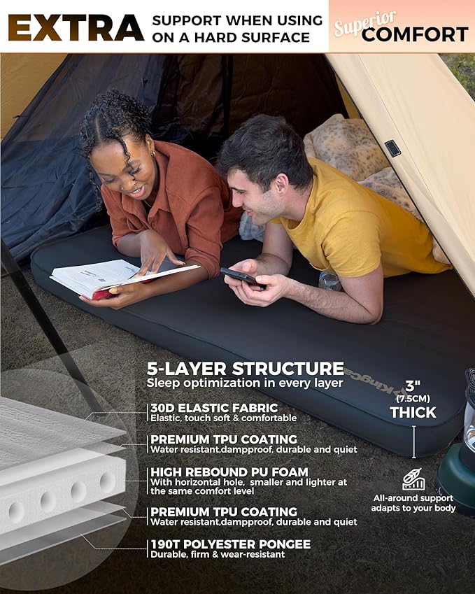 KingCamp Double Sleeping Pad, 2 Person Queen R 7.9 Self Inflating Sleeping Pad, 3" Ultra Thick Full Size Foam Mattress Mat with Pump Sack for Camping Outdoor Tent Car, PVC Free (Black)