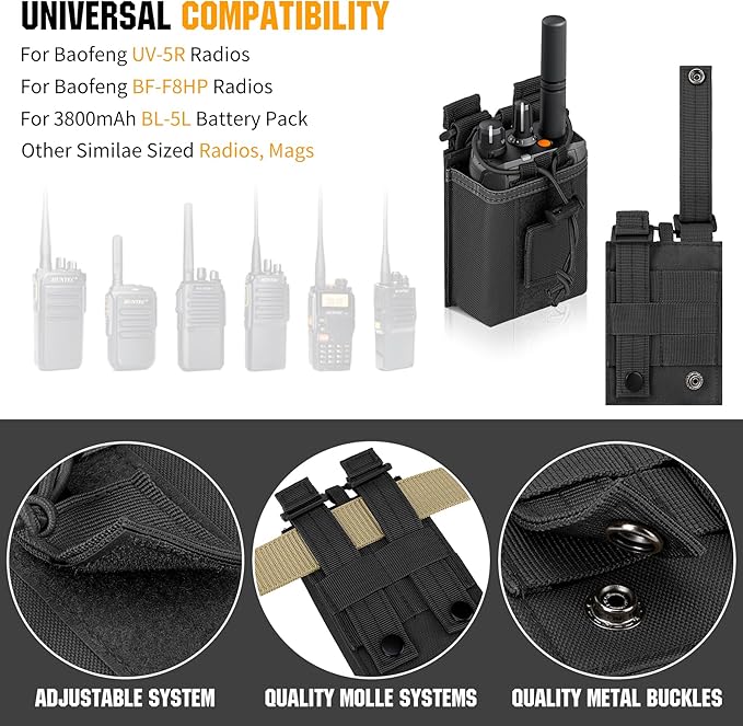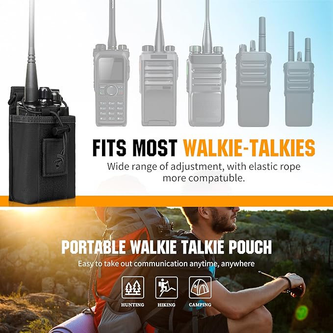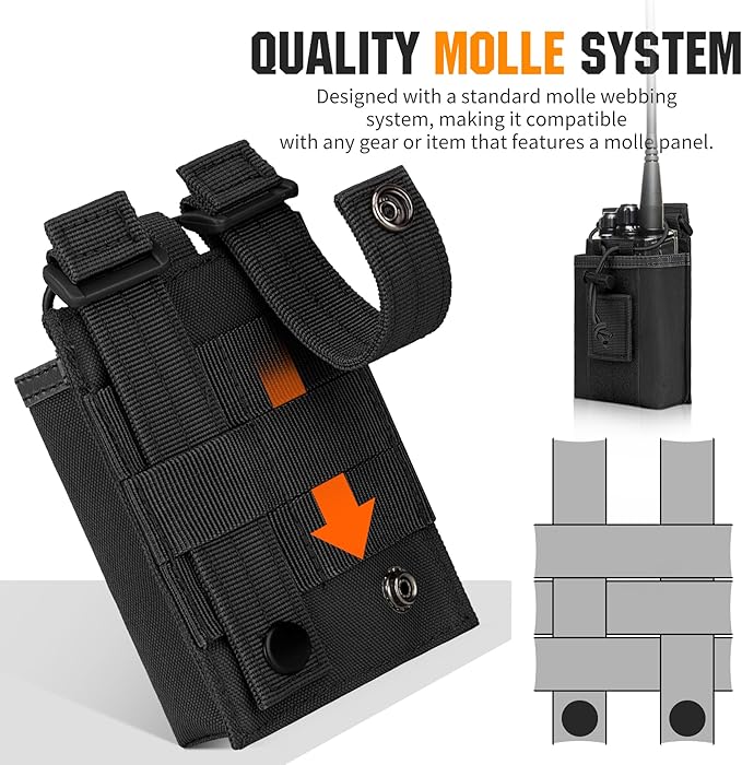 - Adjustable Fastener Design: elastic cord and detachable tape loop to secure the radio inside the radio pouch. The detachable tape loop inside the bag can be adjusted to tighten the radio at different height.