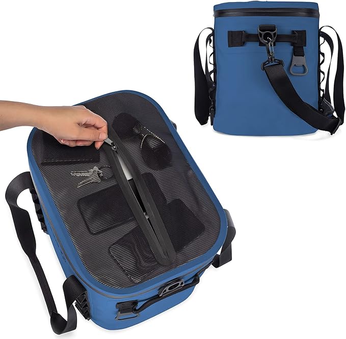 - ADVANCED FEATURES: Large zippered mesh pocket on top lid, for easy access to personal items or other outdoor essentials. Bottle opener is included and attached to the side of the cooler to get the party started. Double-stitched Nylon MOLLE webbing on both sides of the soft sided cooler, provides anchor points to latch onto while boating or to customize with your favorite accessories. In addition, 4 attached D-rings at the base allow for quick fastening to your boat or kayak.