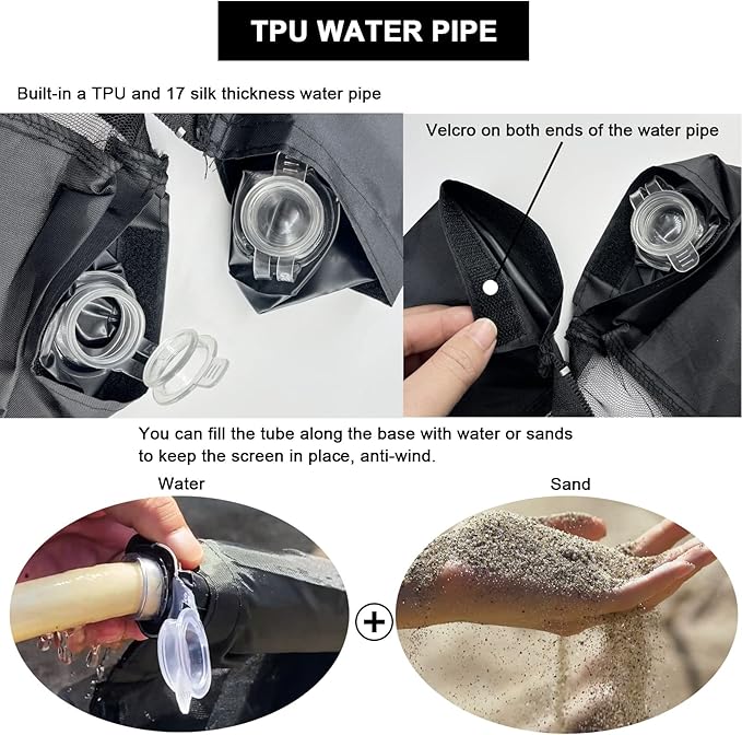 - Stable Bottom: Built-in a TPU and 17 silk thickness water pipe in the umbrella mosquito netting bottom edge, good toughness and durable, just fill the tubes along the base with water to keep the screen in place, no worry about being blown up by the wind.