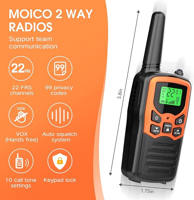 Walkie Talkies, MOICO Long Range Walkie Talkies for Adults with 22 FRS Channels, Family Walkie Talkie with LED Flashlight VOX LCD Display for Hiking Camping Trip (Orange 2 Pack)