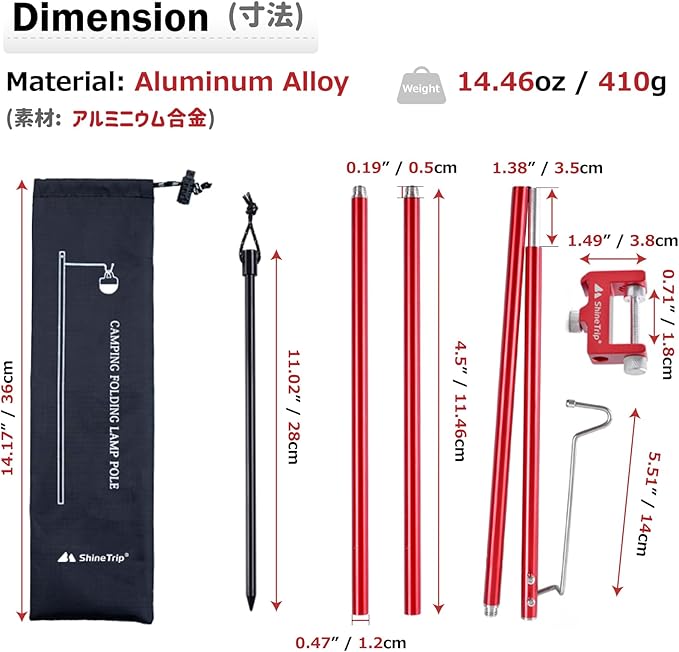 - 🍓 CONVENIENCE: Lamp poles are made of lightweight Alluminum alloy (weight only 11.01oz), compact size, foldable, easy to carry and use. Our aluminium lantern stand also can be used as a bottle opener for convenient use